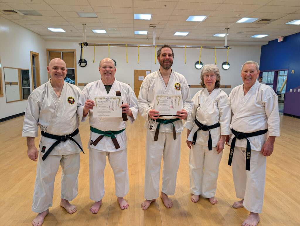 Congratulations to Chris Mariner, Chris Felicetti, and Pearson Snyder on their hard work leading to their successful testing for 二級 (nikyu or Brown Belt). They have all three put in the time and the training, and it shows! Keep coming through that dojo door!